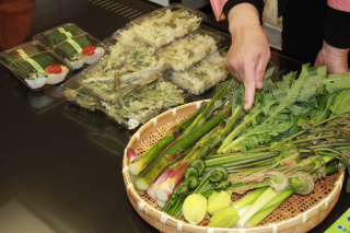 山菜天ぷら、山菜そば、川魚塩焼きやお宿のおかみ特製のお惣菜など販売