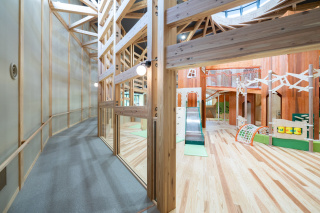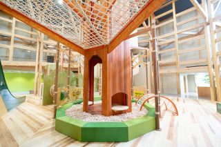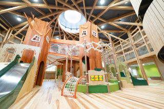 県産の木をふんだんに使った大型遊具には、スライダーやトンネル、はしご、ネットフロア、クライミングウォールなど、こどもたちがワクワクする仕掛けが満載!