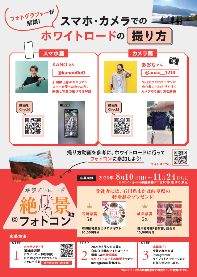 ②2025年6月27日以降に白山白川郷ホワイトロードで撮影されたホワイトロードの写真を ハッシュタグ #ホワイトロードの絶景 を記載して投稿する。