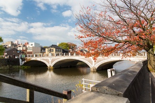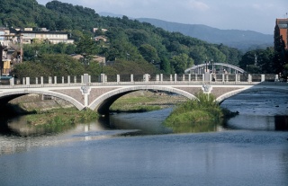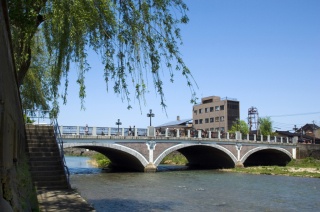 藩政時代からの交通の要所にあり、現在は国道157号上、浅野川に架かる橋です。橋は、1922(大正11)年の建設で橋長55メートル、幅員17メートル、鉄筋コンクリート造3連充腹(じゅうふく=アーチと路面の間に材料が隙間なく敷き詰められていること)のアーチ橋です。スパンドレル部分をドイツ壁風に、アーチ環を目地付きコンクリート洗い出し仕上げとし、橋脚の水切部分には花崗岩を用いています。