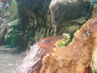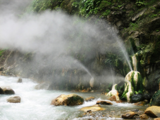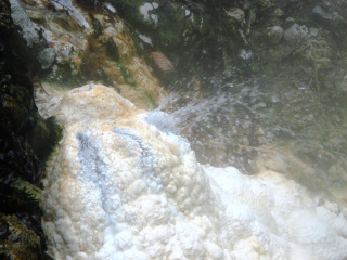 国指定特別天然記念物。岩間温泉の下方中ノ谷にあります。谷底に温泉が噴出しており、その湧出口付近に炭酸石灰が沈積して数個の噴泉塔をつくっています。噴泉塔は高さ1.5m~4ⅿに及び、その頂上部にある小孔から100℃近い熱泉を吹き上げています。