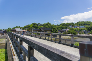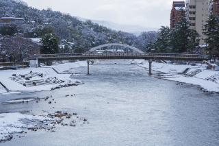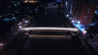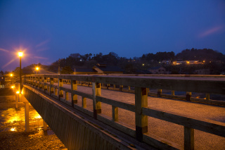 浅野川大橋の上流側に架かる木造風の梅ノ橋。この橋は歩行者専用となっていて兼六園などがある市の中心地から、ひがし茶屋街へ歩いて行くときに便利です。 橋の周辺は地元の文豪・泉鏡花の出世作『義血侠血(ぎけつきょうけつ)』の舞台になっていて、ヒロイン・瀧の白糸像と瀧の白糸碑が建てられています。夜間にはライトアップされているので、ひがし茶屋街で夕食を楽しんだ後に立ち寄ってみるのもおすすめです。