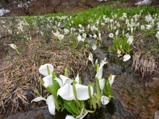 ちょっとしたハイキングに適している大嵐山では、4月下旬~5月上旬にかけて雪解けの湿地から約30,000株のミズバショウが花を咲かせます。