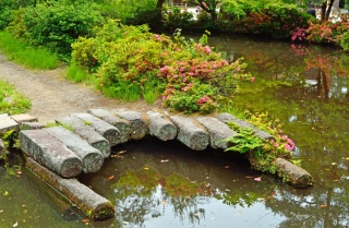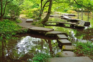 見どころの一つである「神苑」は「楽器の庭」とも呼ばれており、古代舞楽の楽器を模した池泉廻遊式庭園です。1954年に金沢市の指定名勝となりました。「沢渡り」によって「琵琶島」に至り、ここから「八ツ橋」、「琴橋」、「図月橋」等によって「鳳笙島」に回ることができます。楽器の形を想像しながら静かな庭を歩いてみてはいかがですか。