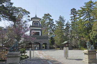 加賀藩初代藩主・前田利家公と正室お松の方を祀る神社です。見どころは国の重要文化財にも指定されている「神門」。和漢洋のそれぞれの様式が用いられた異色の門が訪れる人を惹きつけます。