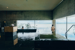 柴山潟、空、森など周辺の自然に溶 け込み、建物からは雄大な白山連峰を背景とした美しい柴山潟の眺望が楽しめます。 窓から水平線のように広がる柴山潟の湖面と浴槽が一体化し、さながら柴山潟に浸かっているような感覚を覚える解放感漂う「潟の湯」と、緑広がる優しい森の景色に安らぎを感じることのできる癒しの空間「森の湯」の2つの浴室があり、定期的に男女を入れ替えてご利用いただきます。