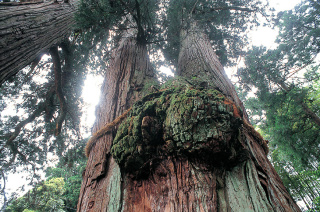 幹の周囲は11m、高さ54mの堂々たる巨木で、樹の下から見上げると、天高く視界いっぱいに青々とした枝が広がっています。