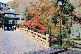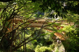 鶴仙渓に架かる総ヒノキ造りの風雅な橋です。四季を彩るその風情に、日本の情緒が感じられます。山中温泉を代表する名勝で、橋から眺める鶴仙渓は絶景です。