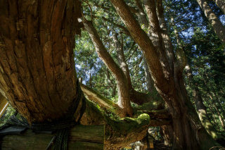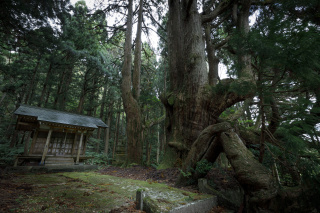 樹齢およそ1200年といわれ、幹周は約8メートル。四方に太い幹を伸ばす姿から「魔王杉」とも呼ばれます。