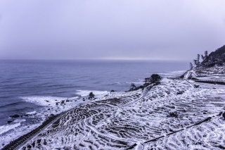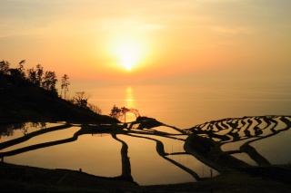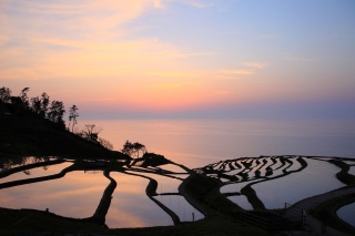 水面に太陽の光がきらめく田植えの季節、日本海に沈む茜色の夕日が棚田を感動的な色に染めていきます。