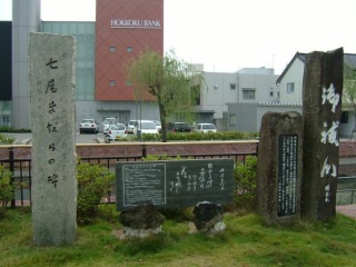 御祓(みそぎ)川の下流にある小公園に建つ石碑です。縦2.35メートル、横45センチ、厚さ32センチの御影石に、詩人・西条八十(やそ)の筆で刻まれています。夜にはライトアップされ、「七尾まだらの碑」の文字がくっきりと浮かびます。