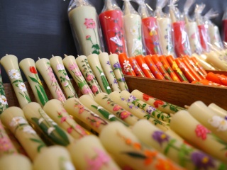ろうそくは仏教の普及と共に、仏壇にともす明かりとして日本に広まったものと考えられています。江戸時代に原料の油をとるハゼの木の栽培が奨励され、ちょうちんの普及と相まって日本各地で和ろうそくは作られました。現在は仏事、祭礼用として使われています。