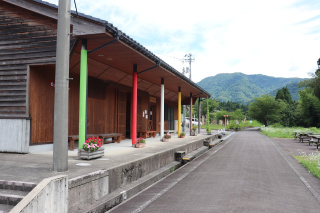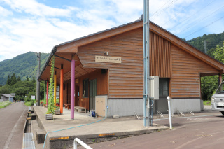 かつての北陸鉄道金名線の終点「白山下駅」があったところ。金名線は1987年に廃止されて、線路跡がサイクリングロード「手取キャニオンロード」になりました。白山下駅跡の周辺は「白山下サイクリングパーク」として整備され、新たに駅舎風の建物が建てられて、サイクルステーションとして利用されています。トイレも完備しており、サイクリング中の休憩にも便利です。