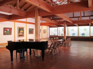 加賀平野の西端、小高い丘、雑木や竹に囲まれた木造の美術館です。木組み、木舞い、土壁白漆喰い仕上げ。木製建具、天然の石材によって造られています。